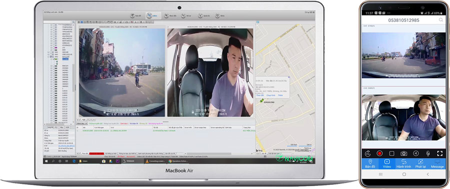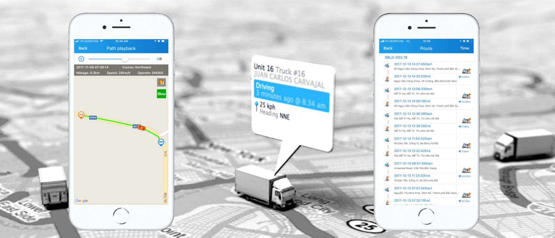 Theo dõi phương tiện với đầy đủ các thông tin về vị trí, lộ trình, vận tốc, trạng thái bật tắt máy theo thời gian thực trên smart phone và máy tính